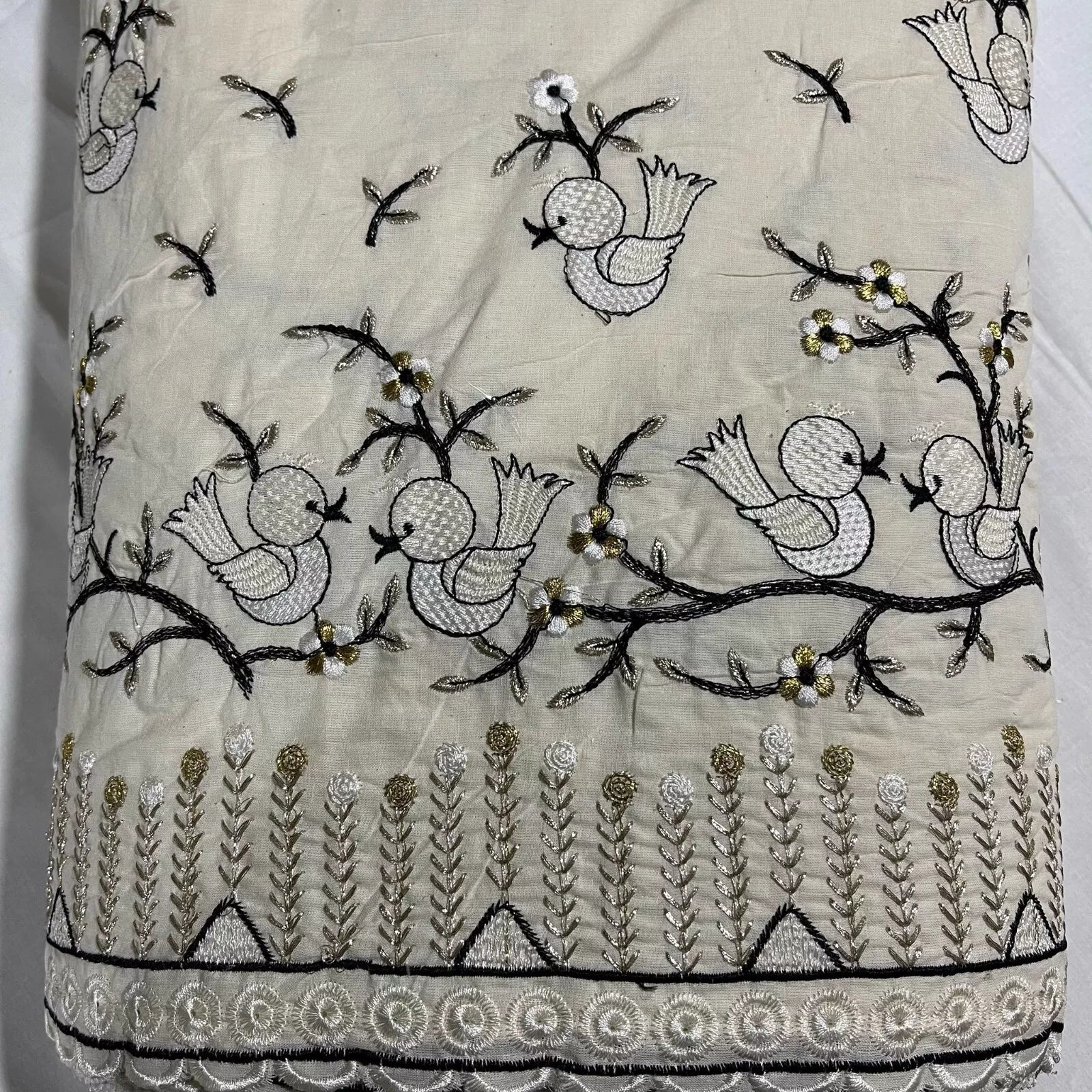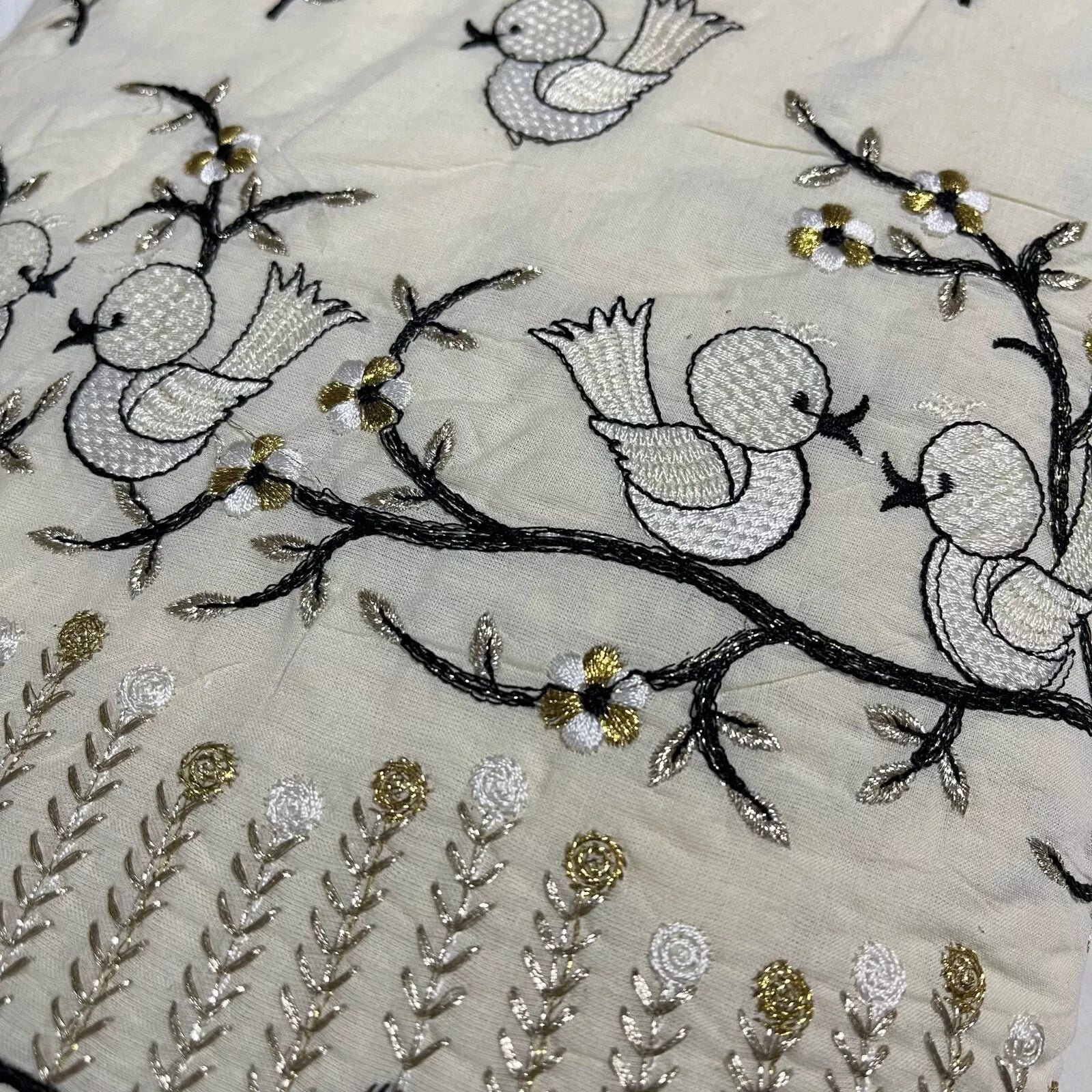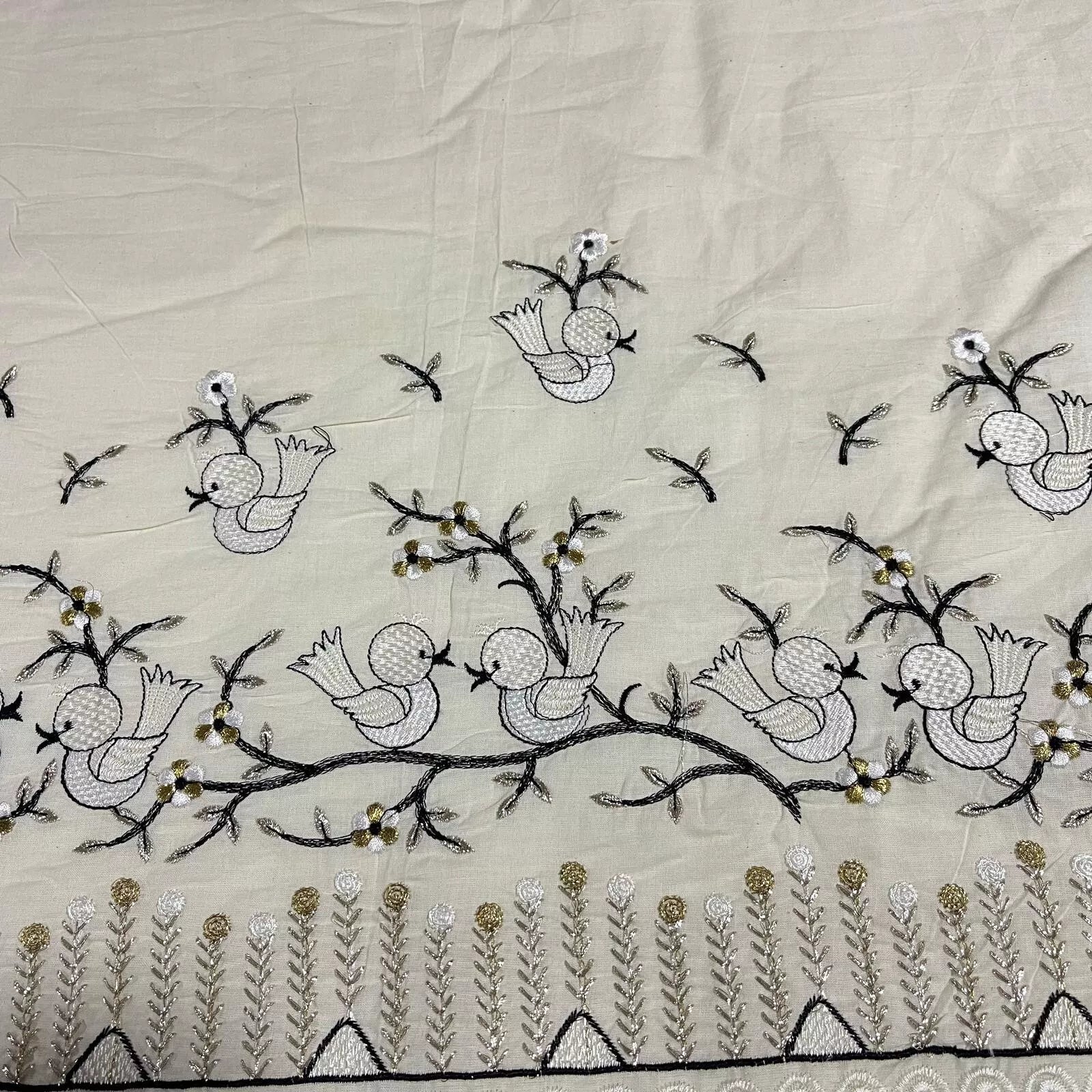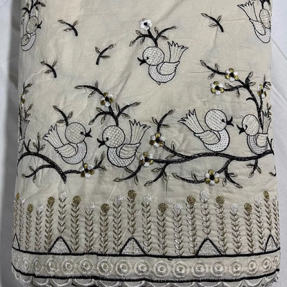 Raw Cotton Floral Embroidery Fabric with Golden Zari | 44" (112cm) Wide Dyeable Dress & Craft Material – Sold by the Meter